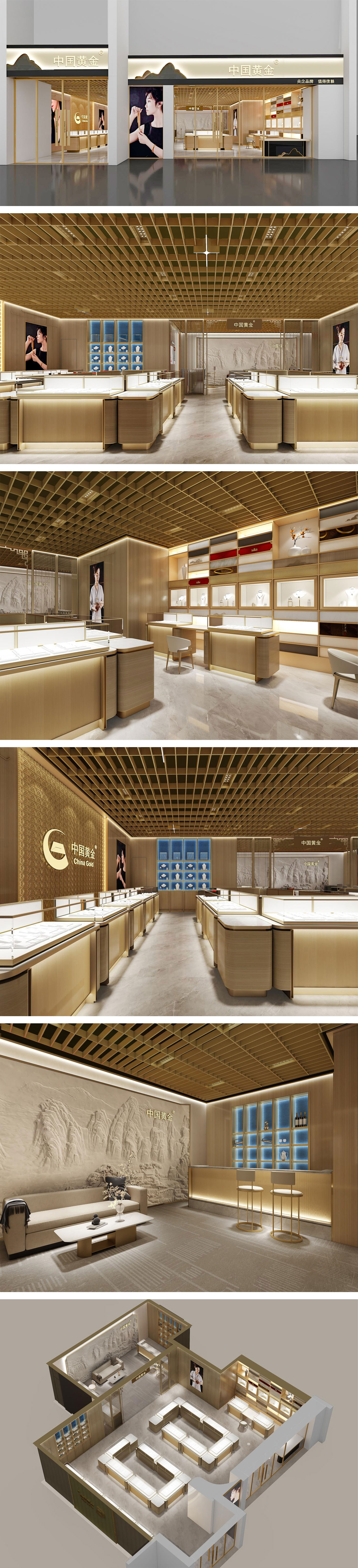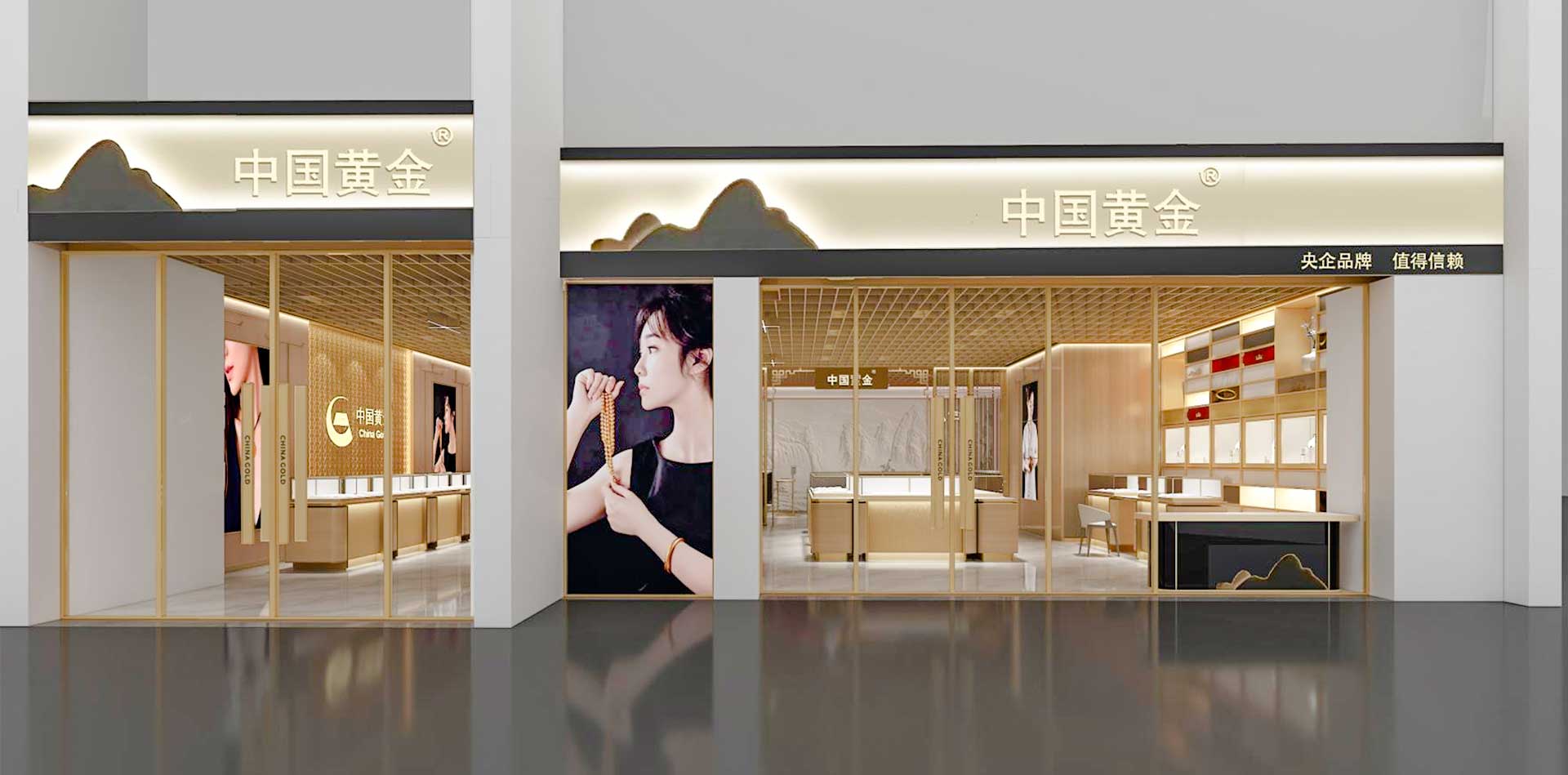 該項目繼承了徽州民居的傳統建筑風格,整體色彩淡雅、古樸。門頭的設計運用了山的形,使品牌門店更加具有辨識度。設計師將當地建筑特點中的黑灰色融入其中,與“中國黃金”的品牌形象——“中金金”和“中金藍”相結合,使品牌更加融入本土。