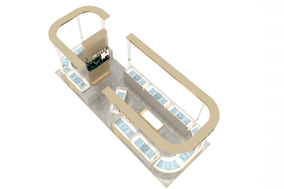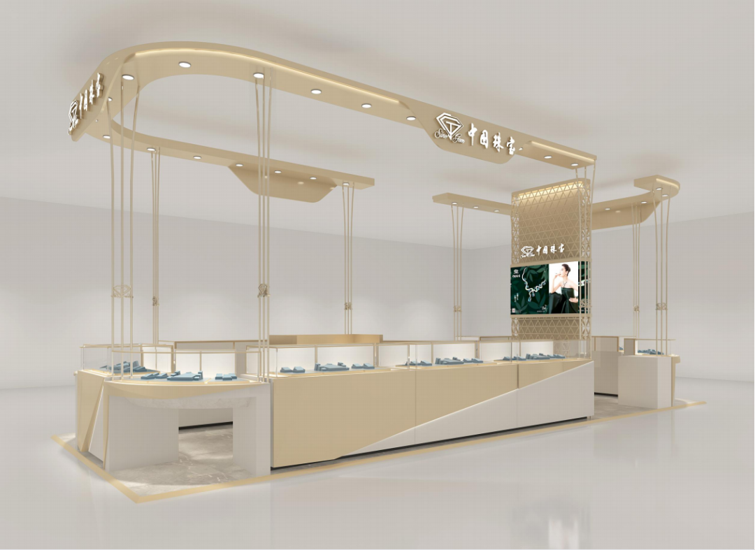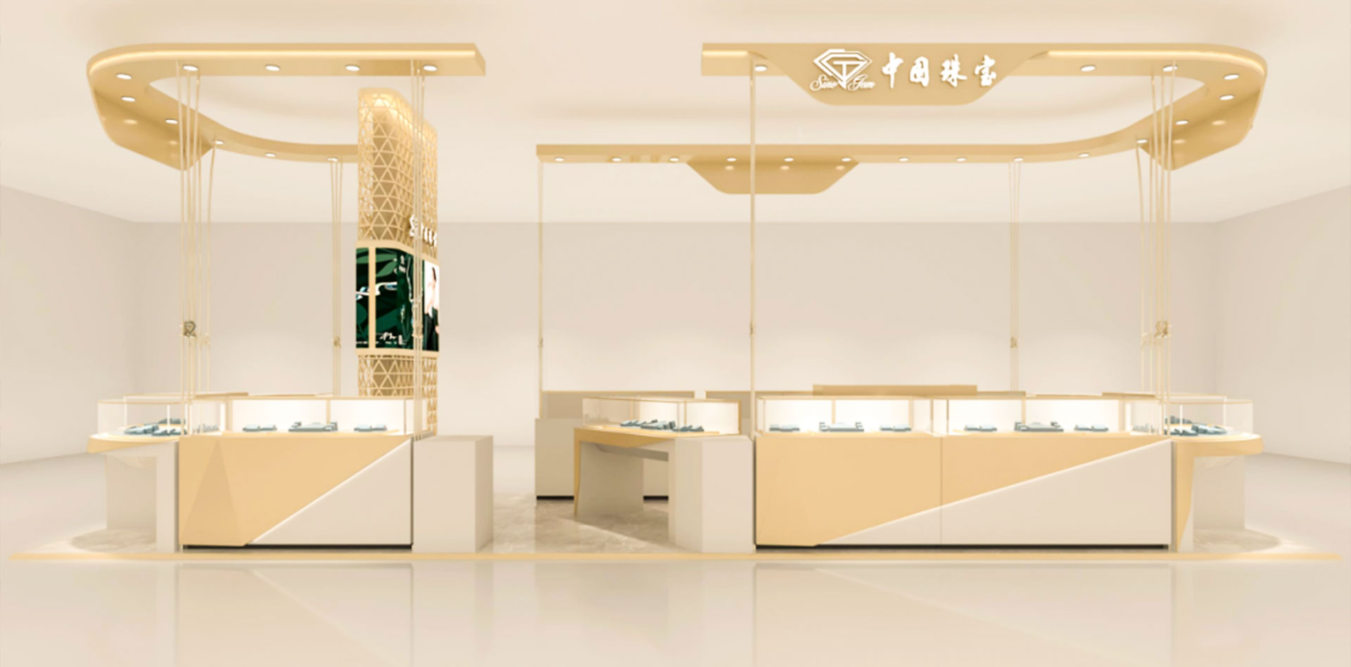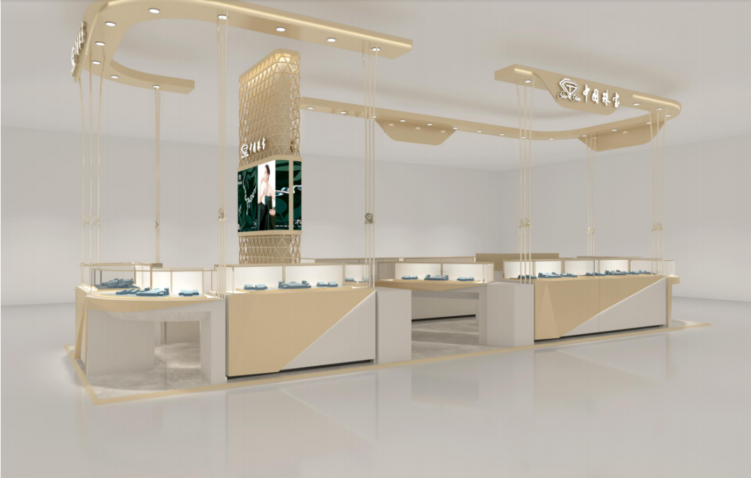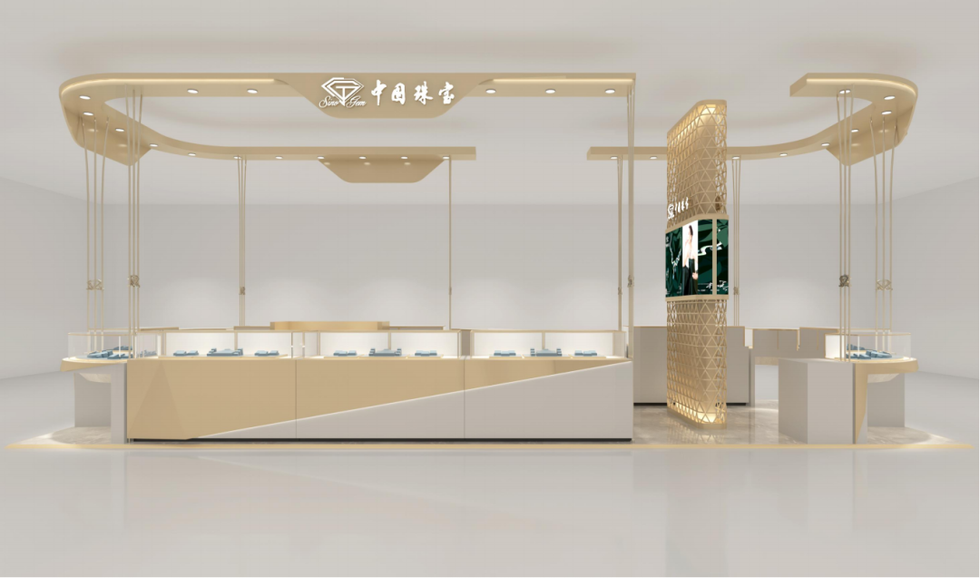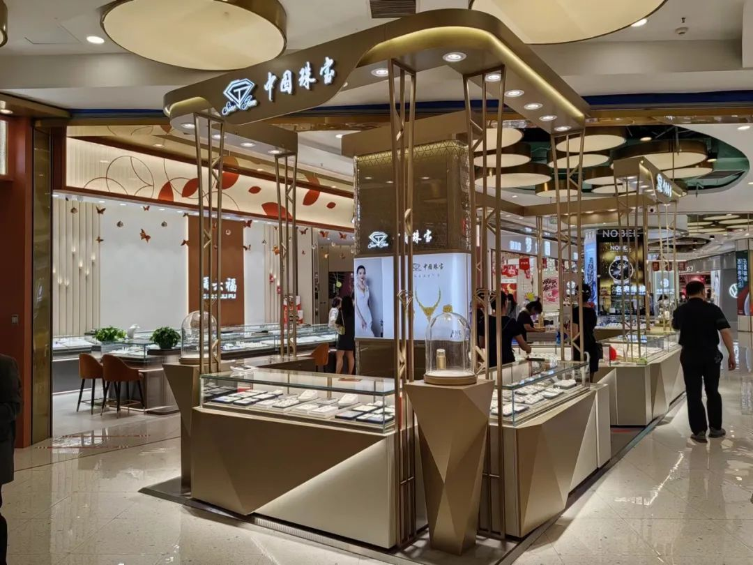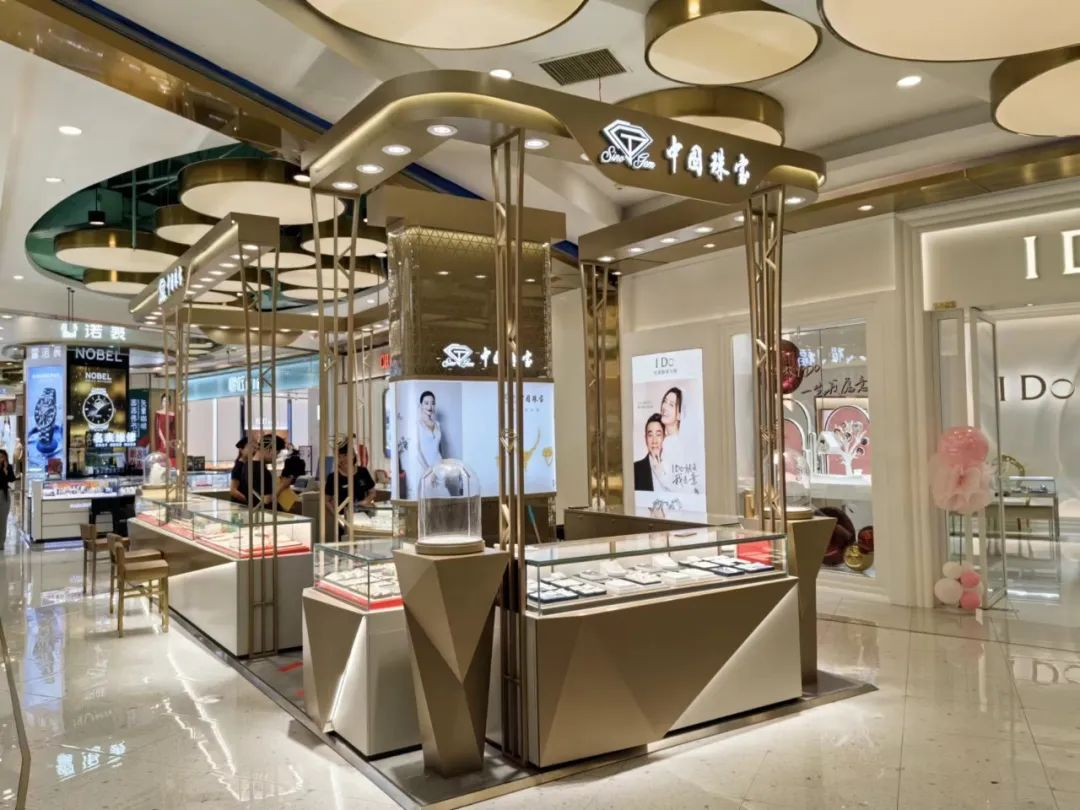 2023年5月10日,中國珠寶義烏金華萬達中島店正式開業。“中國珠寶”品牌 Si系統的“中島”設計中,店面通過在最大的墻體或包柱上將統一的品牌形象墻呈現,使品牌形象更加突出,燈帶的設計與邊廳的門楣保持一致。鉆石切割式柜臺在整個空間中凸顯,增加品牌的獨特識別度。