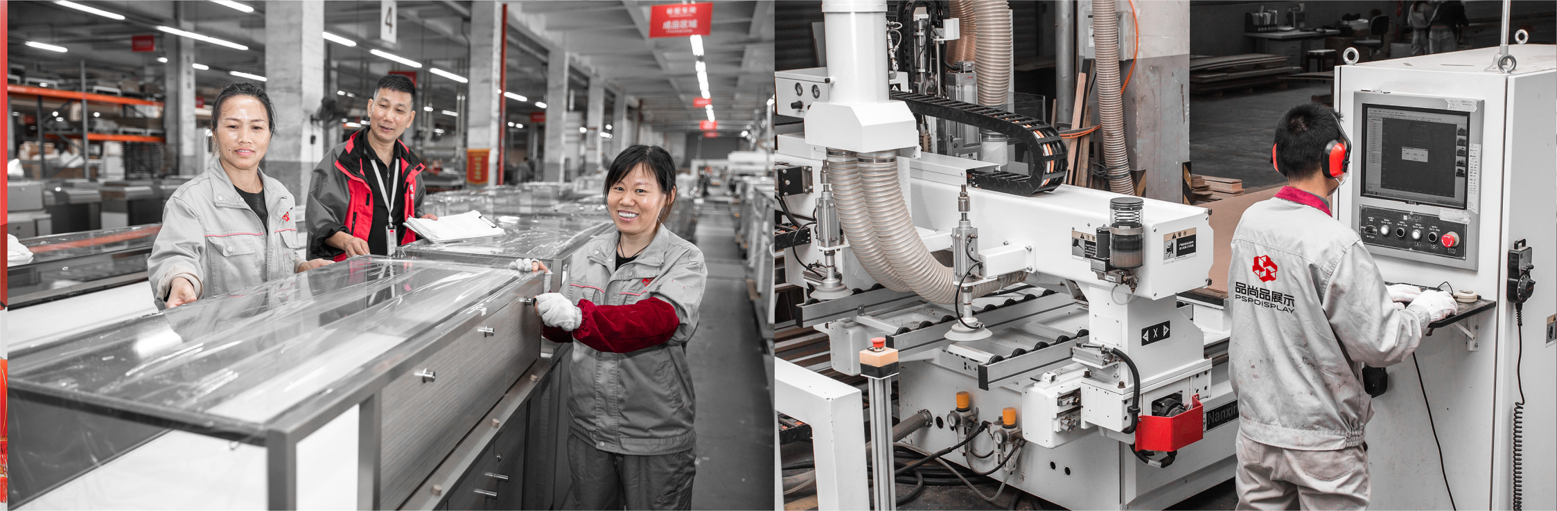 我們的生產團隊會根據客戶的需求和品牌形象,為客戶提供個性化的展柜設計方案。同時,我們的生產團隊會嚴格把控每一個生產環節,確保每一款展柜都符合品質要求。